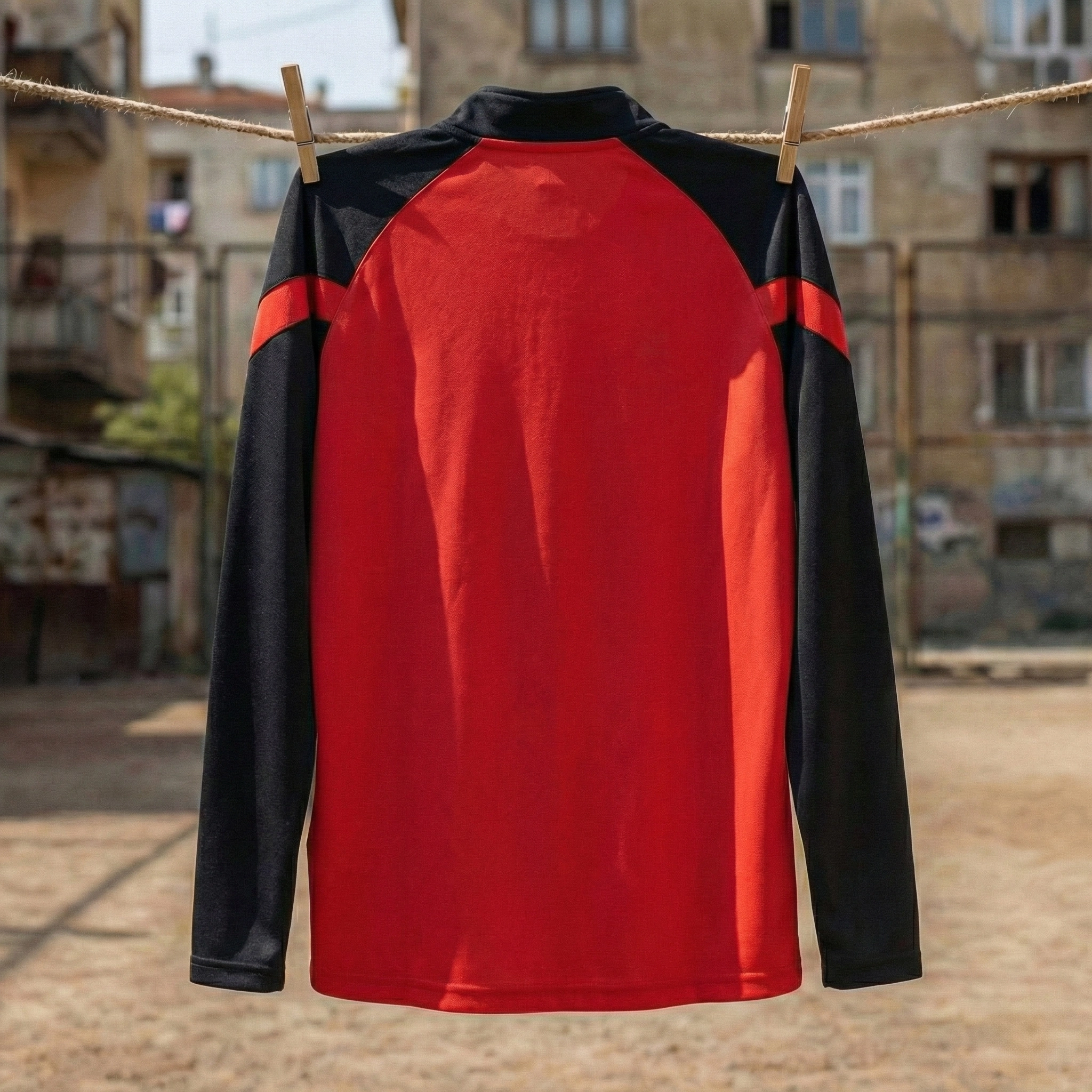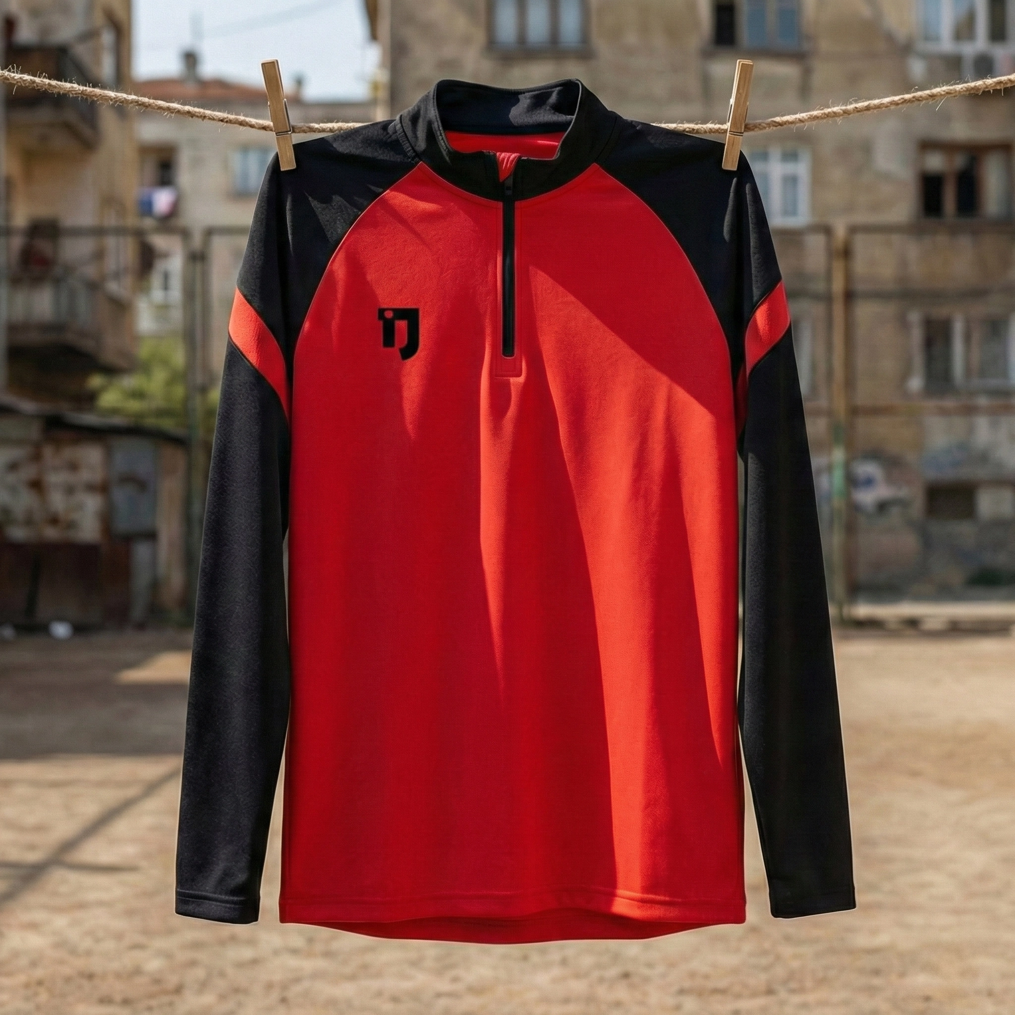Üst parça yarım fermuarlı (1/4 zip) yapısıyla pratik kullanım sunarken, yüksek yakası rüzgâr ve serin havalara karşı ekstra koruma sağlar. Omuz ve kol bölgelerinde kullanılan siyah paneller, hem estetik denge oluşturur hem de hareket kabiliyetini destekler.